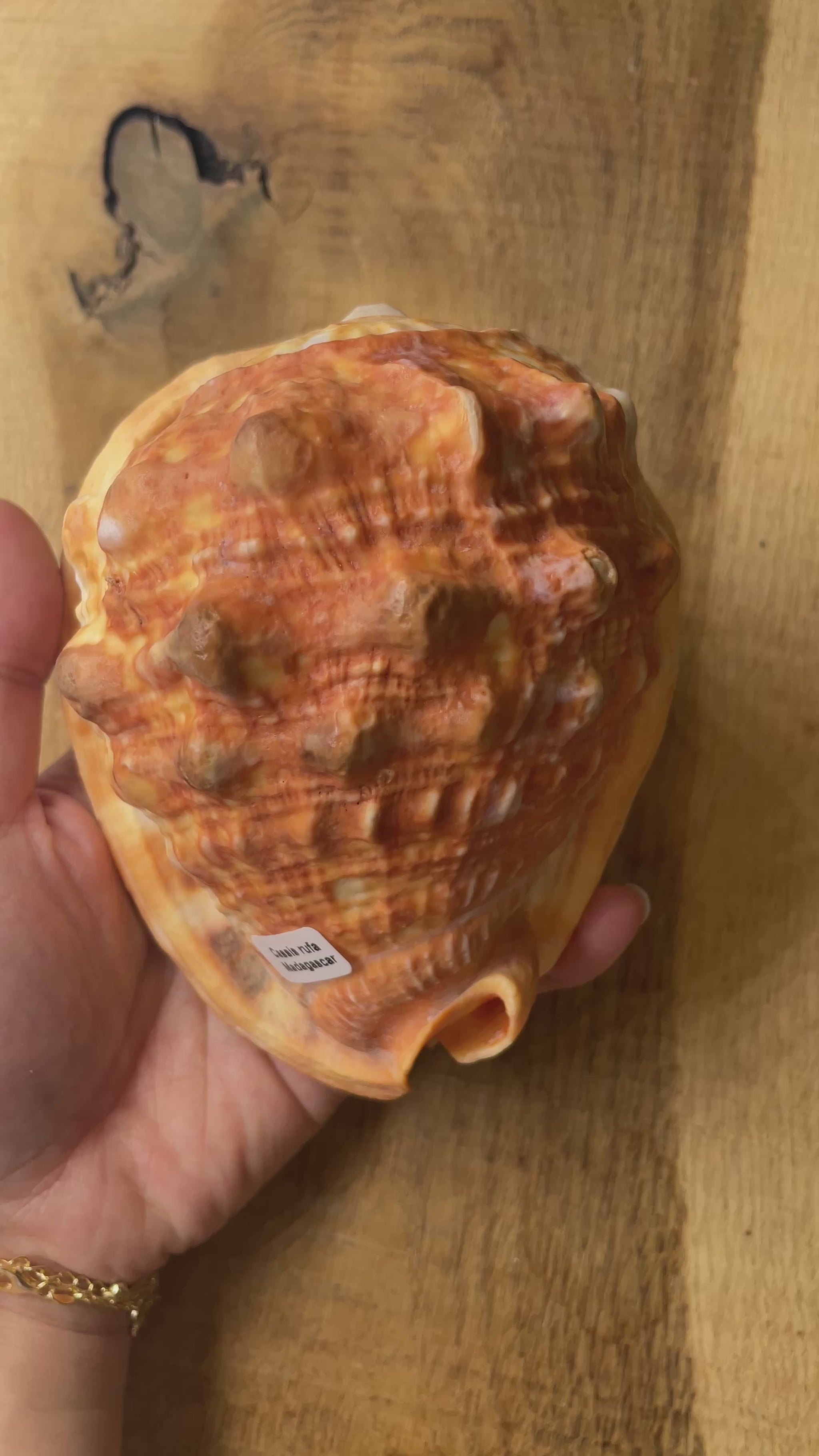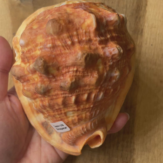 Le Cassis rufa, aussi appelé casque rouge, est un coquillage marin spectaculaire originaire des côtes de Madagascar. Sa coquille épaisse et robuste présente de magnifiques nuances d’orange, de brun et de blanc, avec des motifs naturels uniques qui en font une véritable pièce de collection.