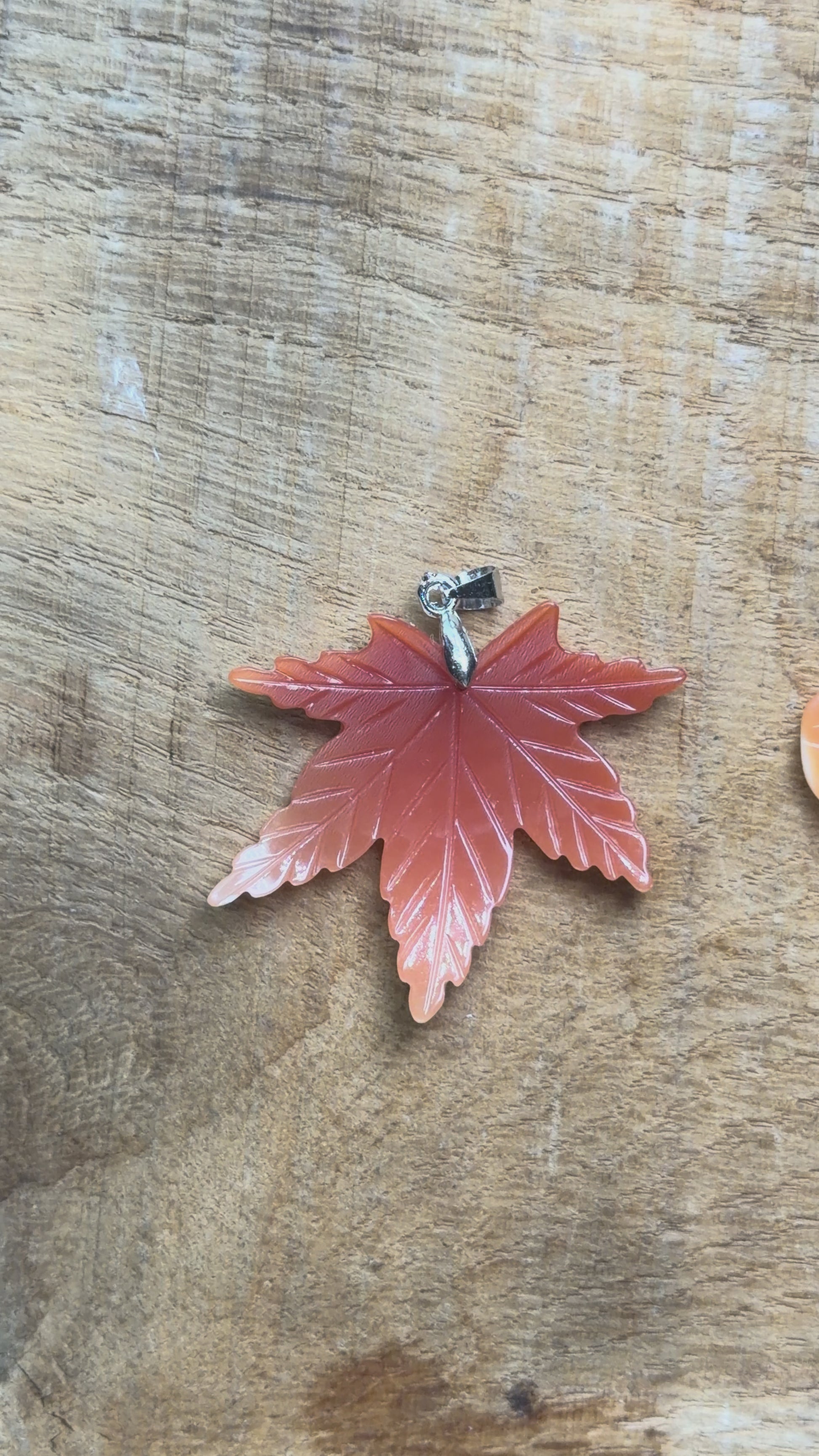 Ce pendentif représente une feuille délicatement sculptée, réalisée en nacre de Tumau, une nacre naturelle réputée pour sa teinte orange chaleureuse et ses reflets subtils et satinés.