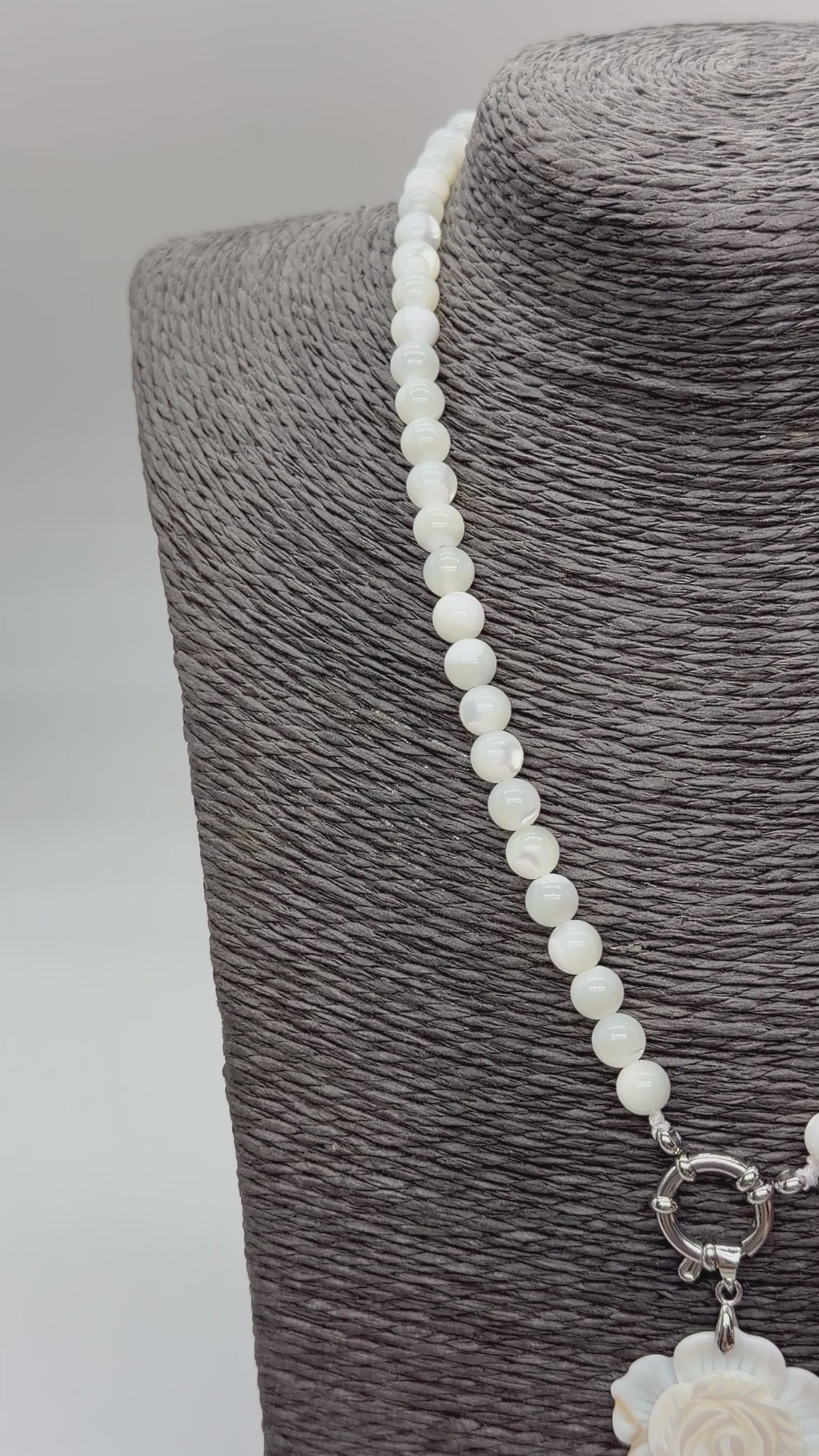 Collier boule en nacre attache bouée en acier argenté avec pendentif fleur