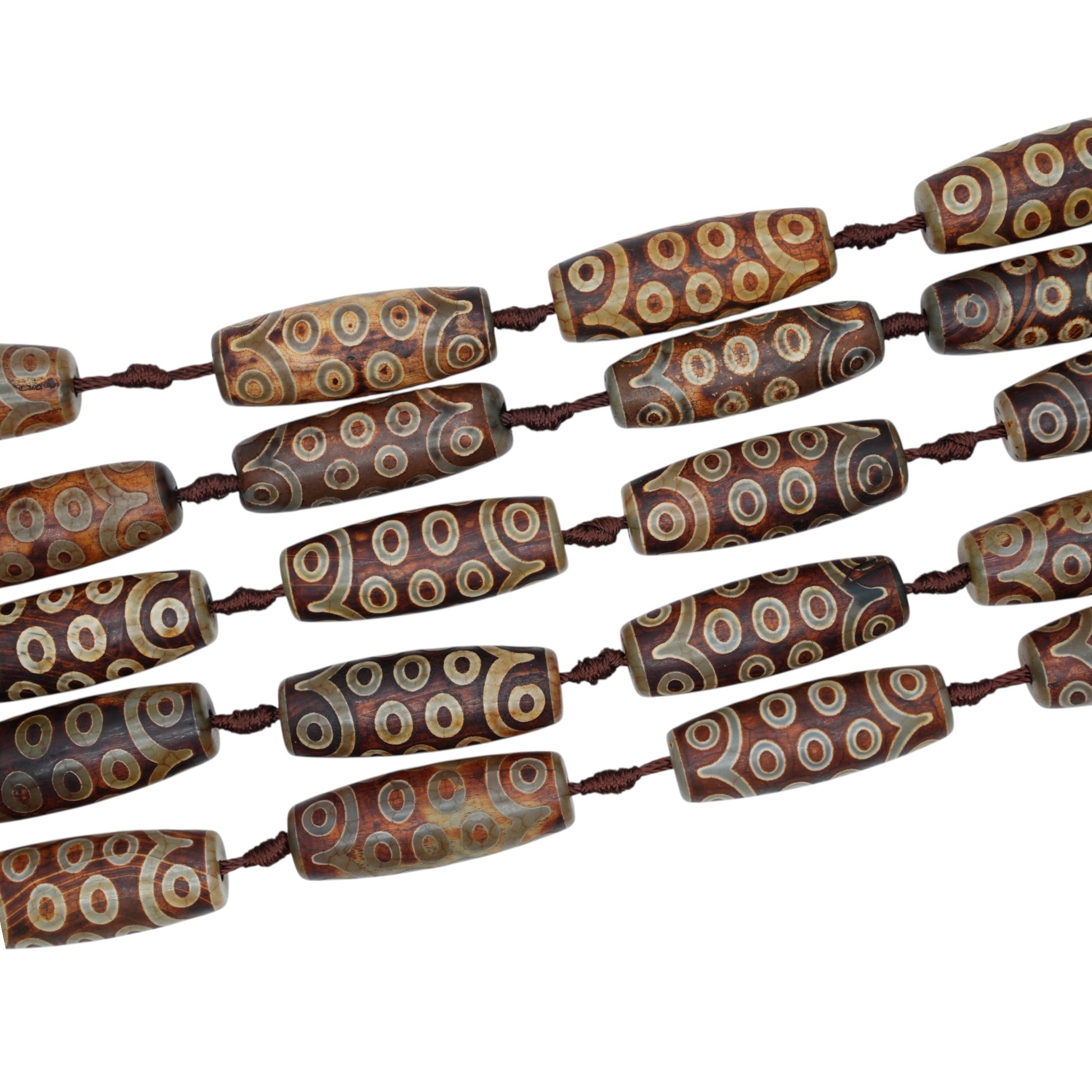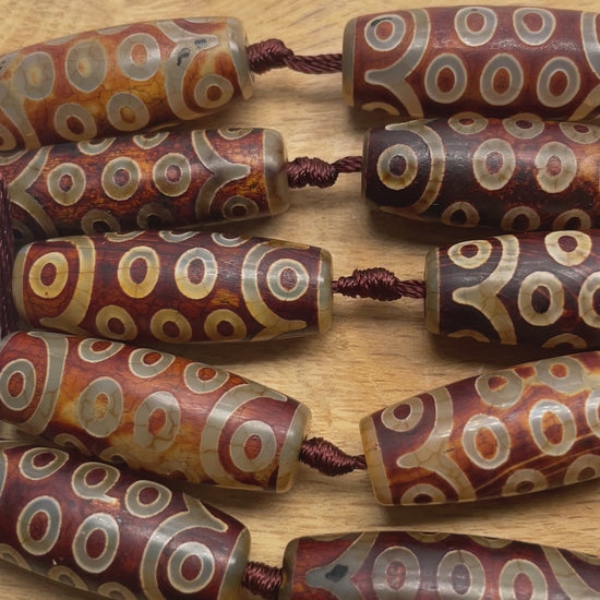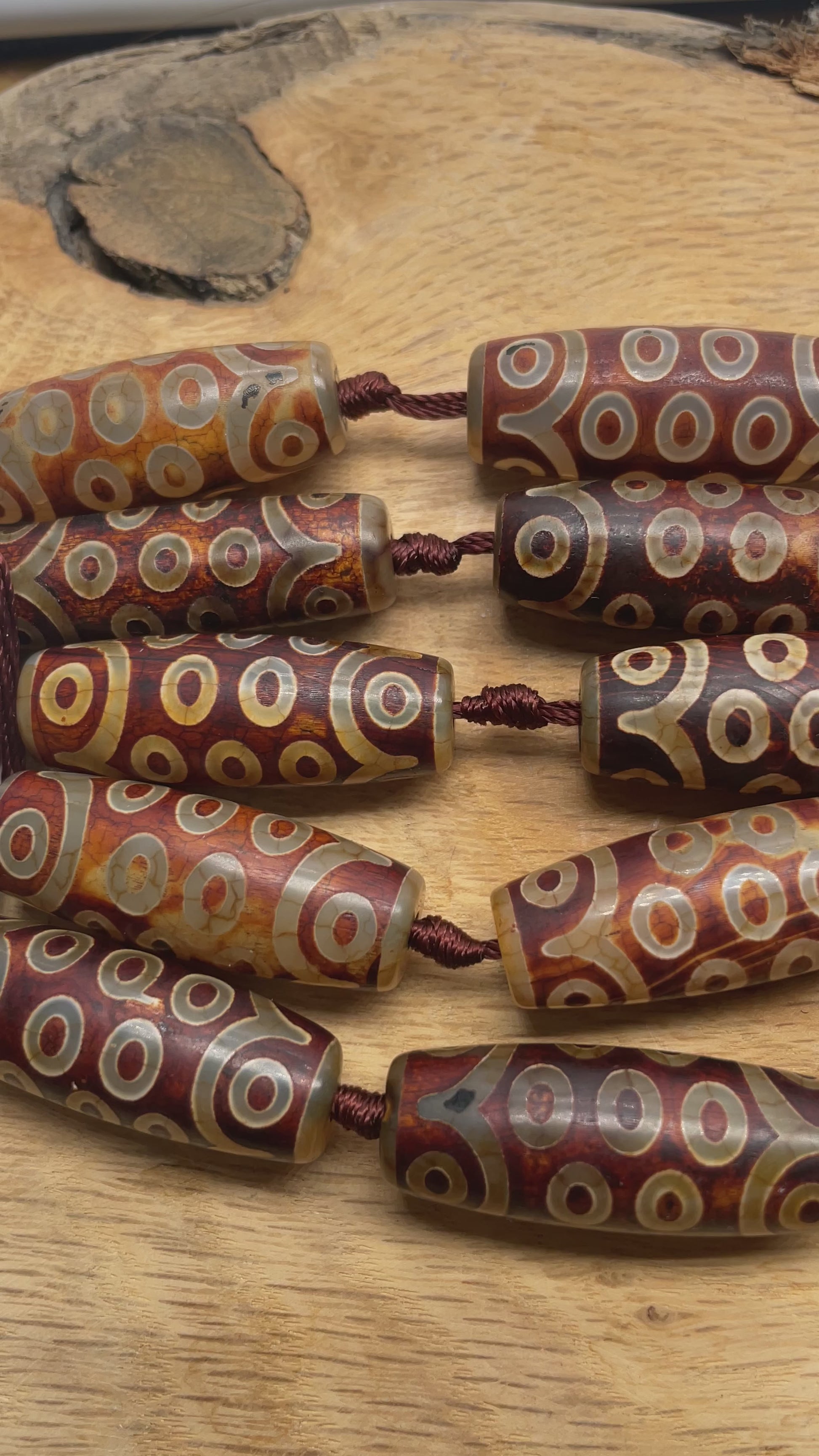 Les perle Dzi sont des perles d’agate gravées de lignes géométriques et de motif en forme d’œil (pour conjurer le mauvais œil) en nombre impair (pour porter chance).