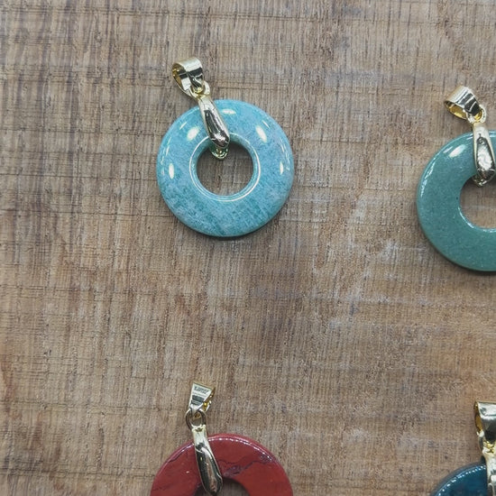 Ce pendentif donut en pierre naturelle de 25 mm est monté avec une bélière au choix : dorée ou argentée.