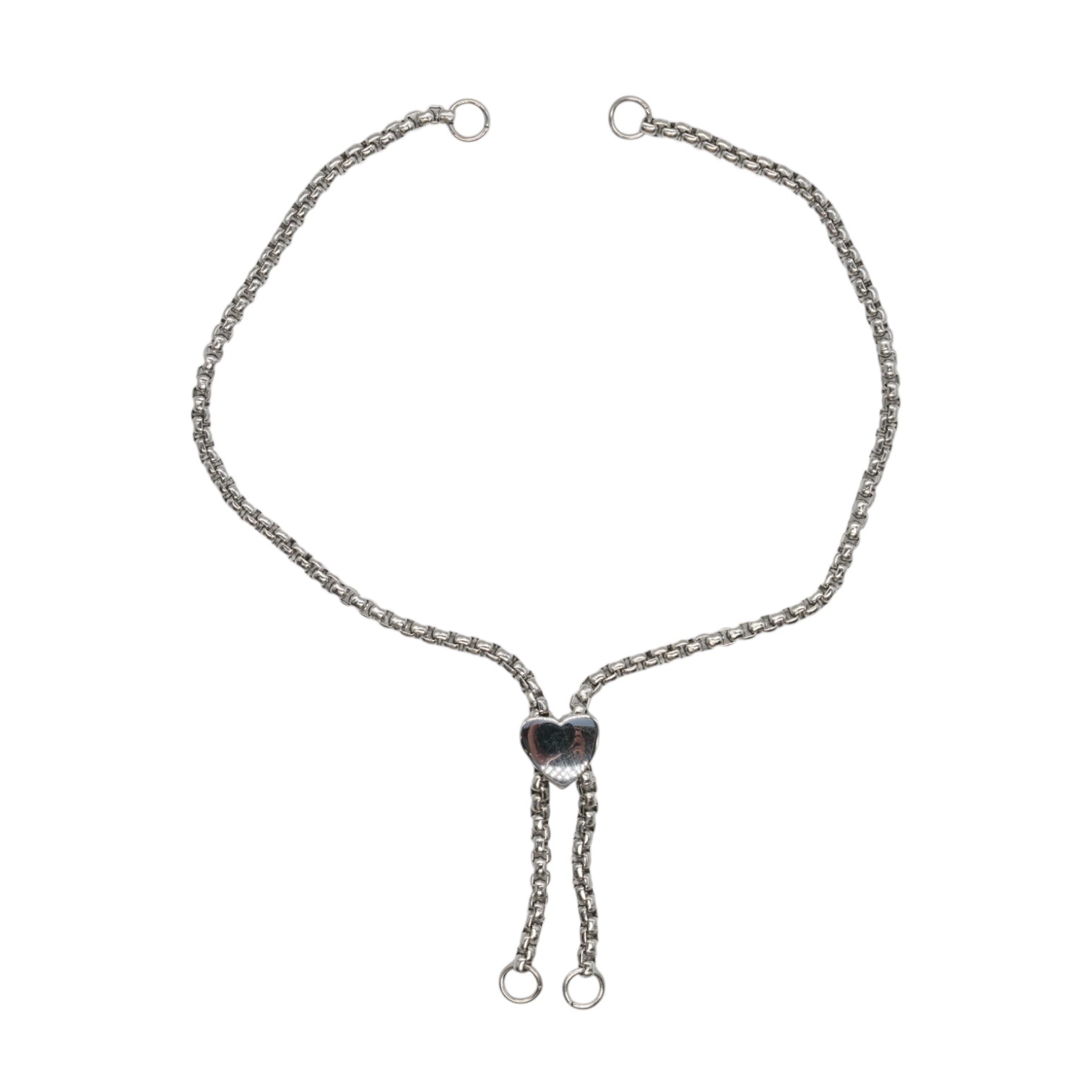 Les deux anneaux situés à l’extrémité servent à fixer les deux côtés du bijou. La perle cœur, dotée d’un intérieur en silicone, coulisse le long de la chaîne pour raccourcir ou allonger le bijou selon la taille souhaitée.