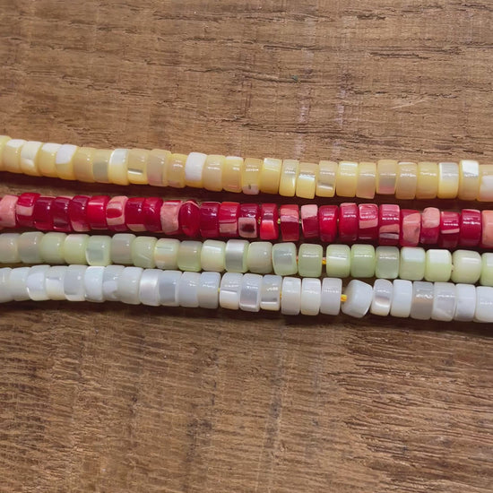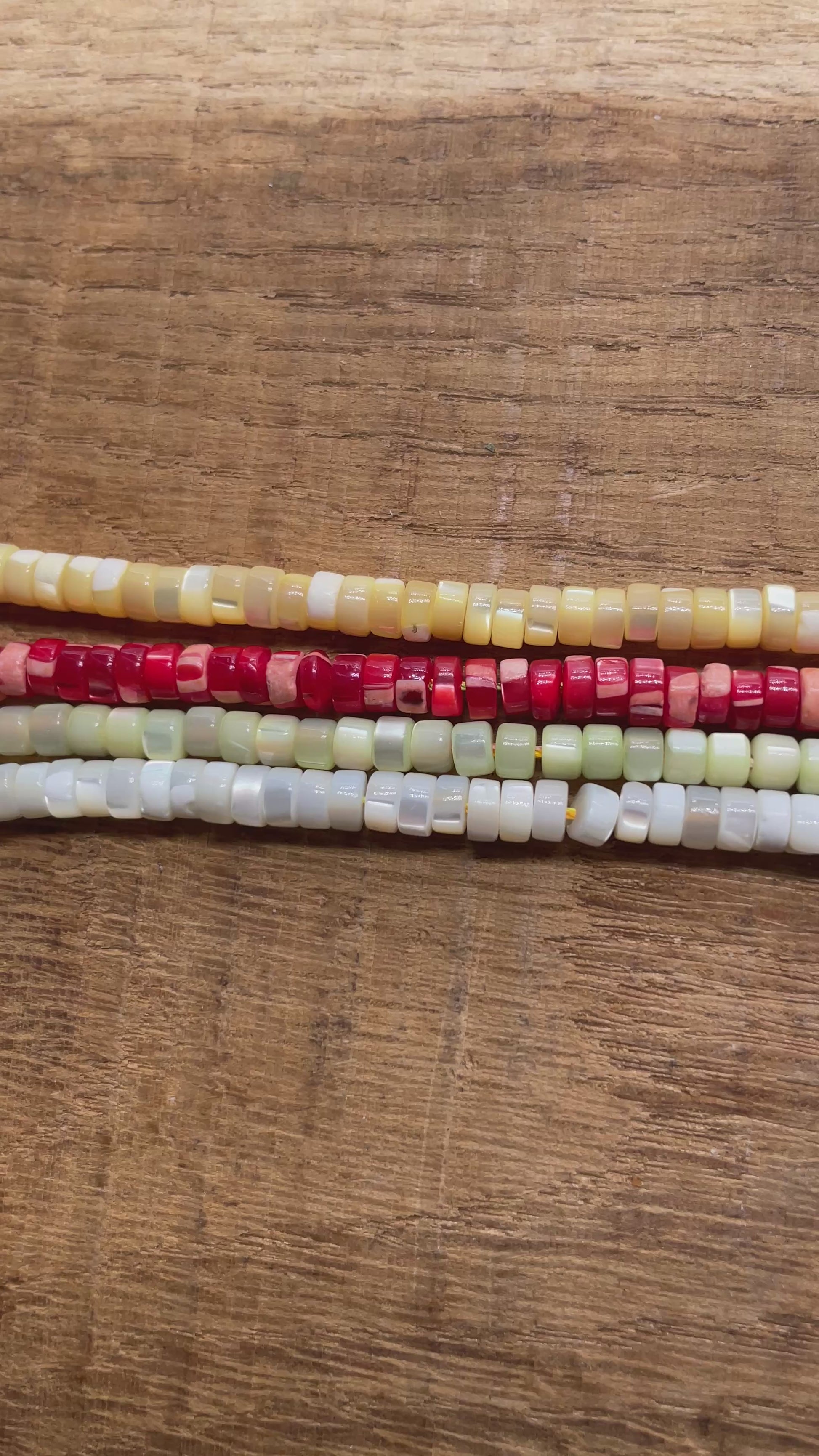 Fil de perles Heishi en Nacre chauffée sauf la blanche qui est naturelle.