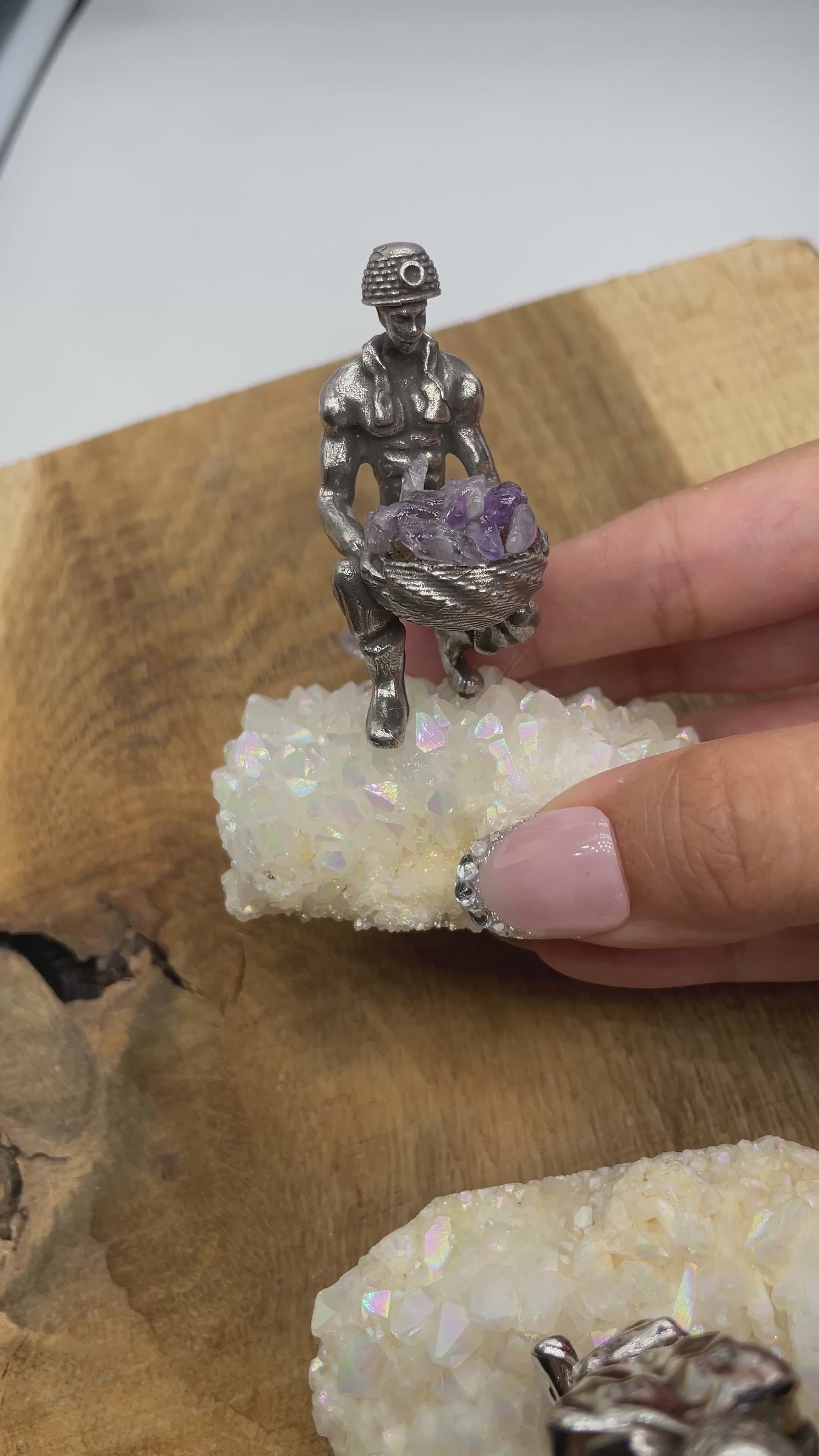 Ces superbes figurines représentent des mineurs en métal argenté, chacun portant ou extrayant des cristaux d’améthyste. Chaque scène est mise en valeur sur une base de cristal aqua aura (quartz naturel recouvert d’un traitement à l’or donnant un effet iridescent et nacré).