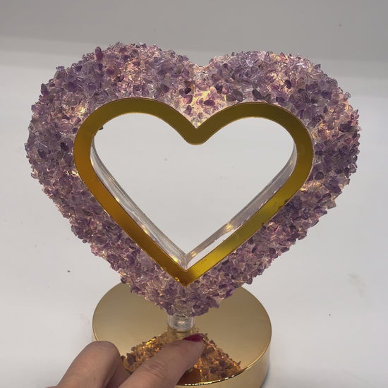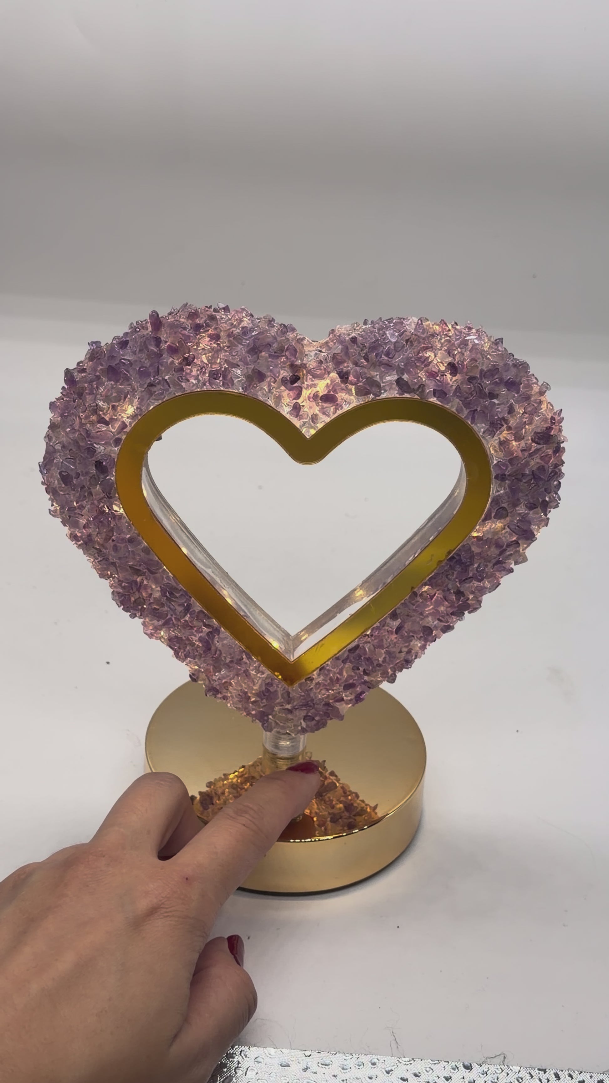 lampe en forme de cœur, sublimée par de véritables mini-pierres améthyste naturelle.