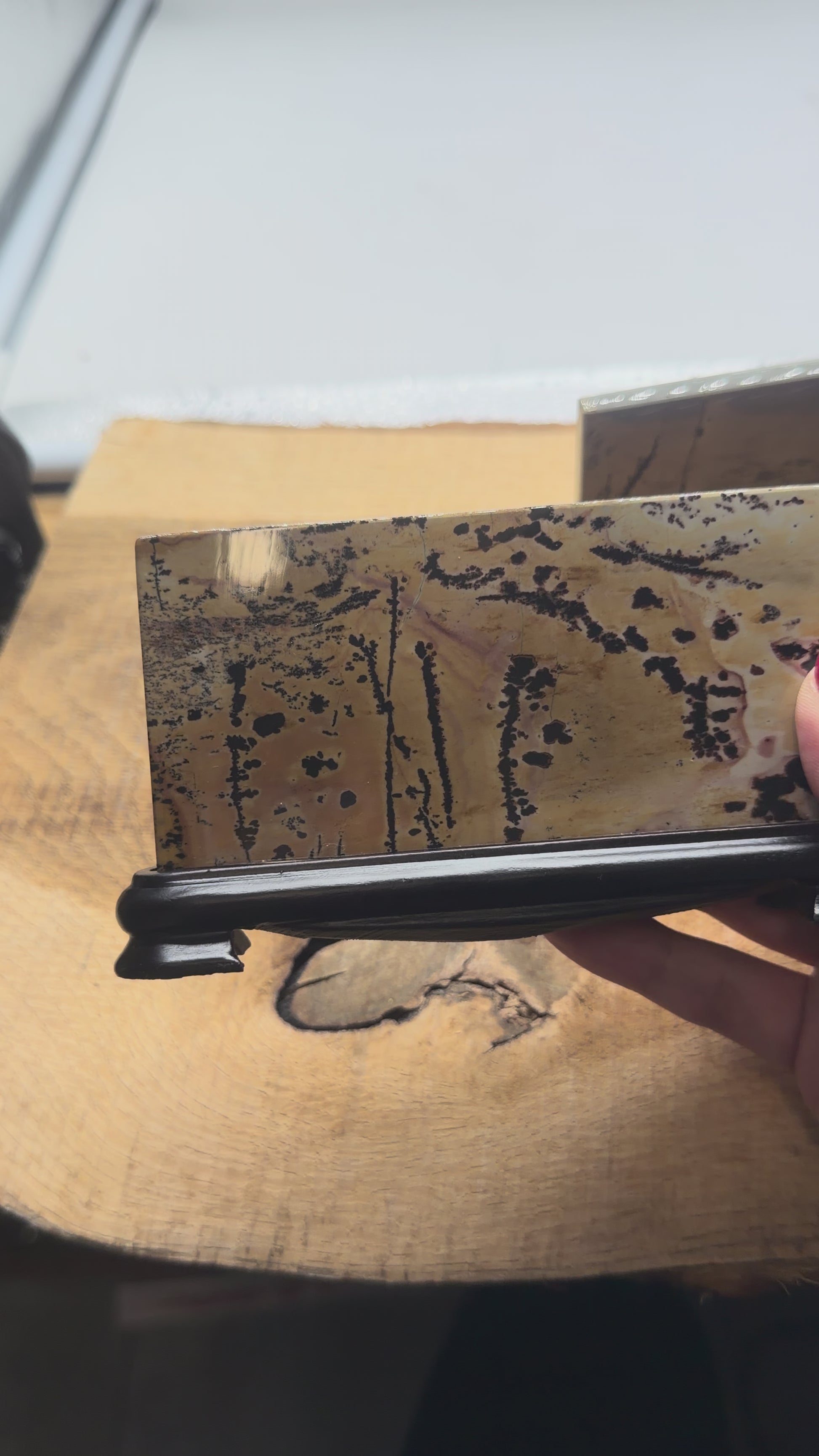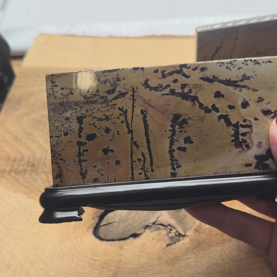 Ces plaques en jaspe paysage sont entièrement naturelles et taillées dans une seule pièce de pierre avec le support (non démontable)